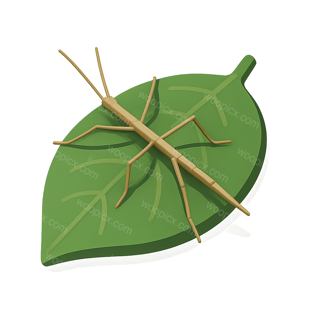 /Premium/Collection: /by davooda/Type: PNG/A stylized 3D icon of a stick insect camouflaged on a green leaf. The insect features a volumetric design and is presented in a three-quarter view against a soft, blurred background.