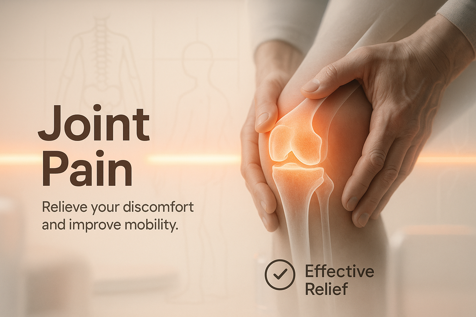 Informative healthcare graphic focusing on joint pain relief, featuring a soothing design with a human knee illustration. Ideal for clinics and wellness centers.