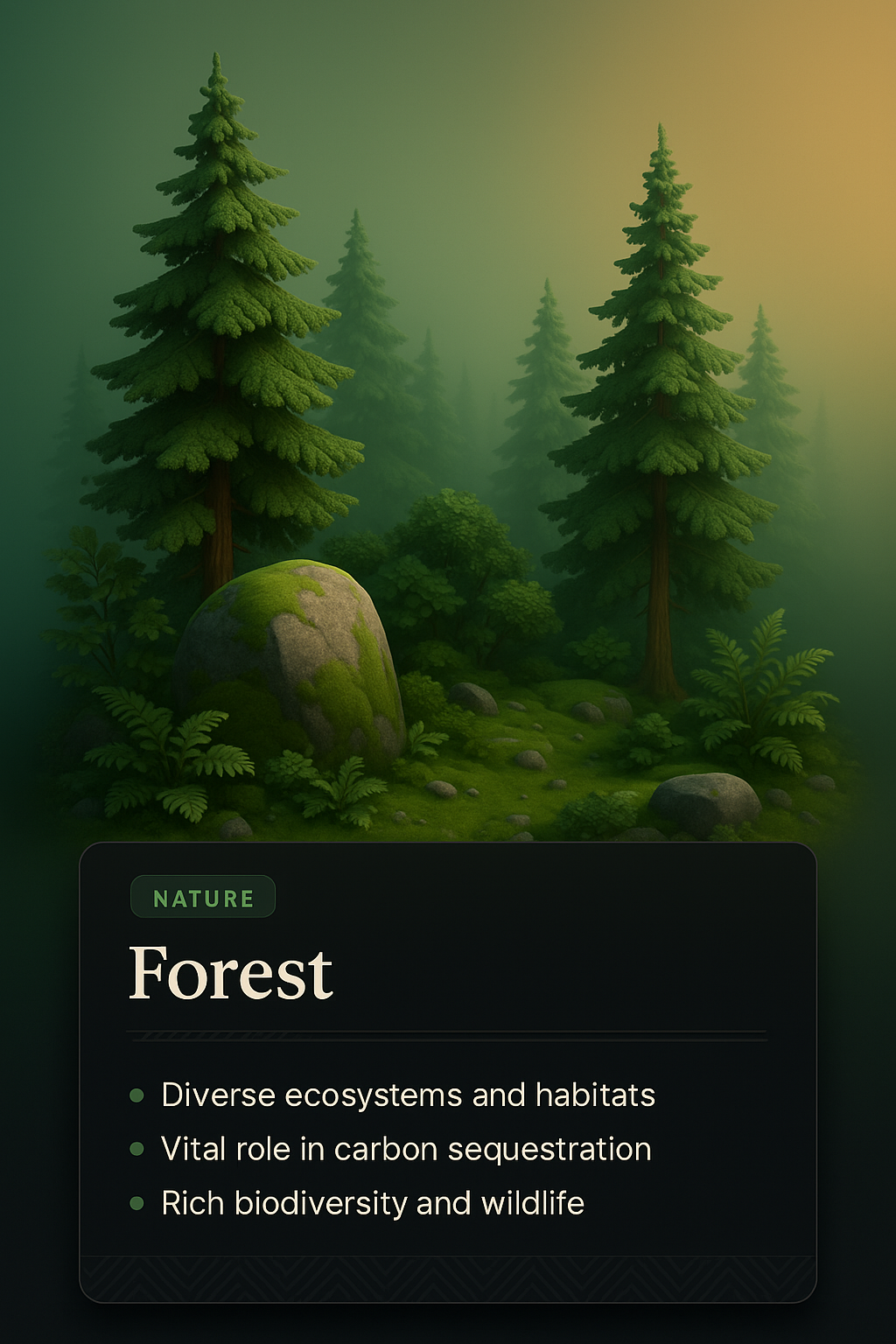 A captivating 3D forest scene featuring lush trees and rocks, accompanied by a dark overlay with informative text about forest ecosystems and biodiversity.