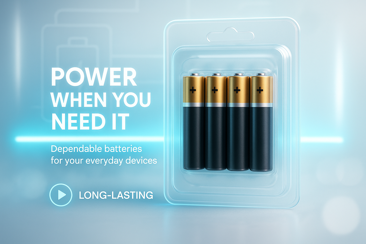 Stylish product packaging for batteries, showcasing a sleek design with a focus on functionality. Ideal for e-commerce and retail marketing.