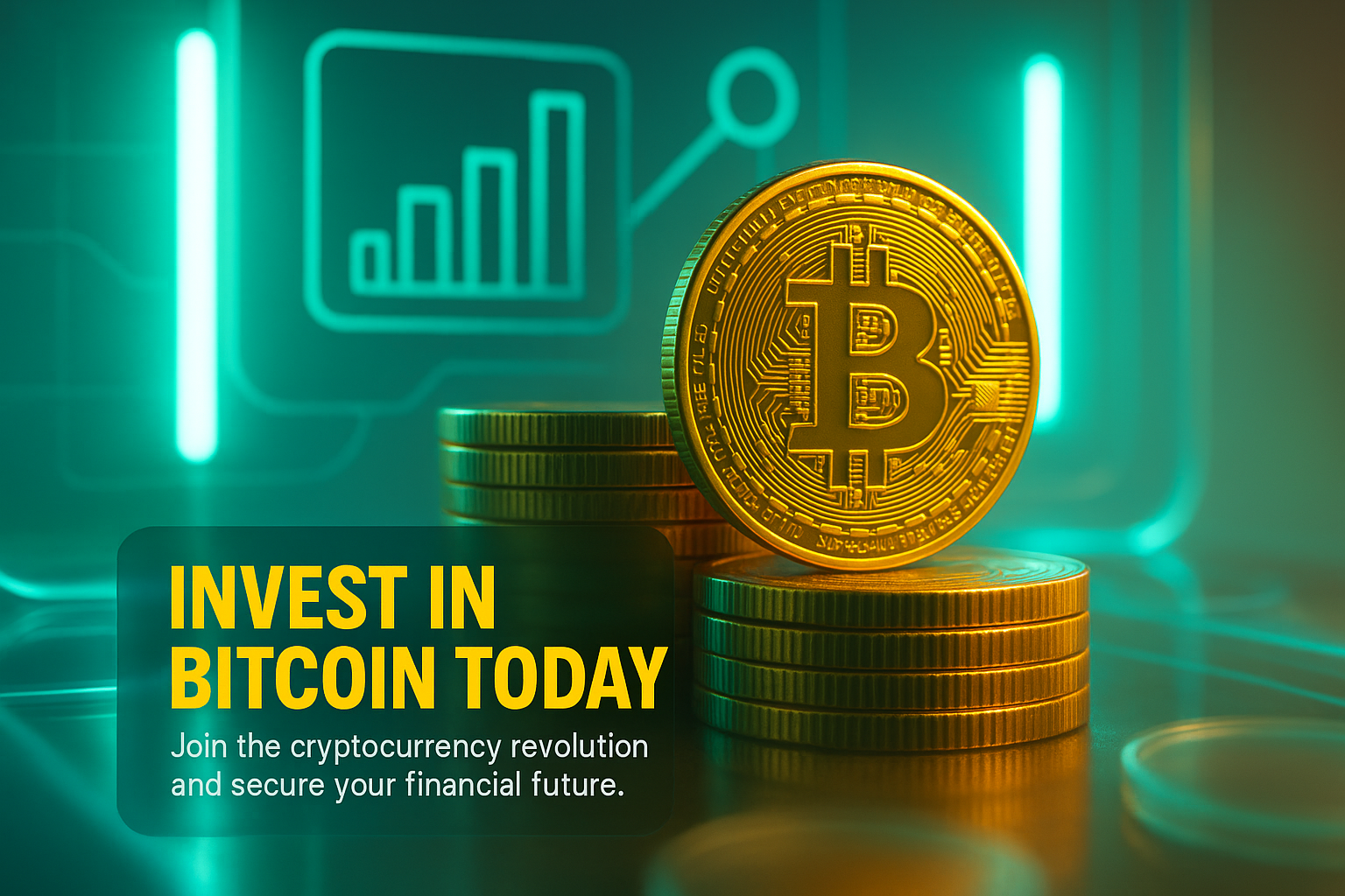 Captivating digital graphic promoting Bitcoin investment with vibrant colors and modern design elements, aimed at attracting cryptocurrency enthusiasts.
