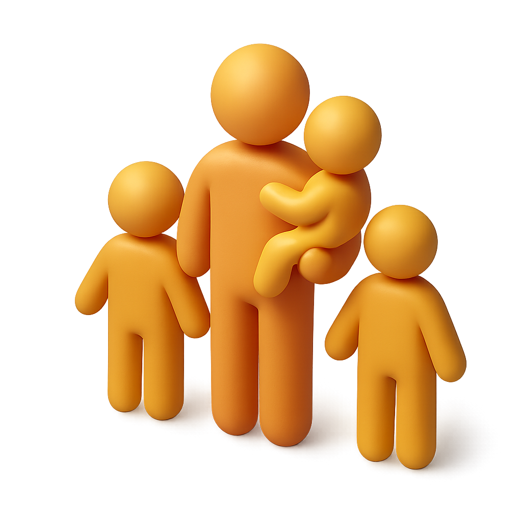 /Collection: /by davooda/Type: PNG/A simplistic 3D icon featuring a person holding a child, flanked by two others. The figures are in a warm yellow hue, set against a gradient background, emphasizing a family theme.