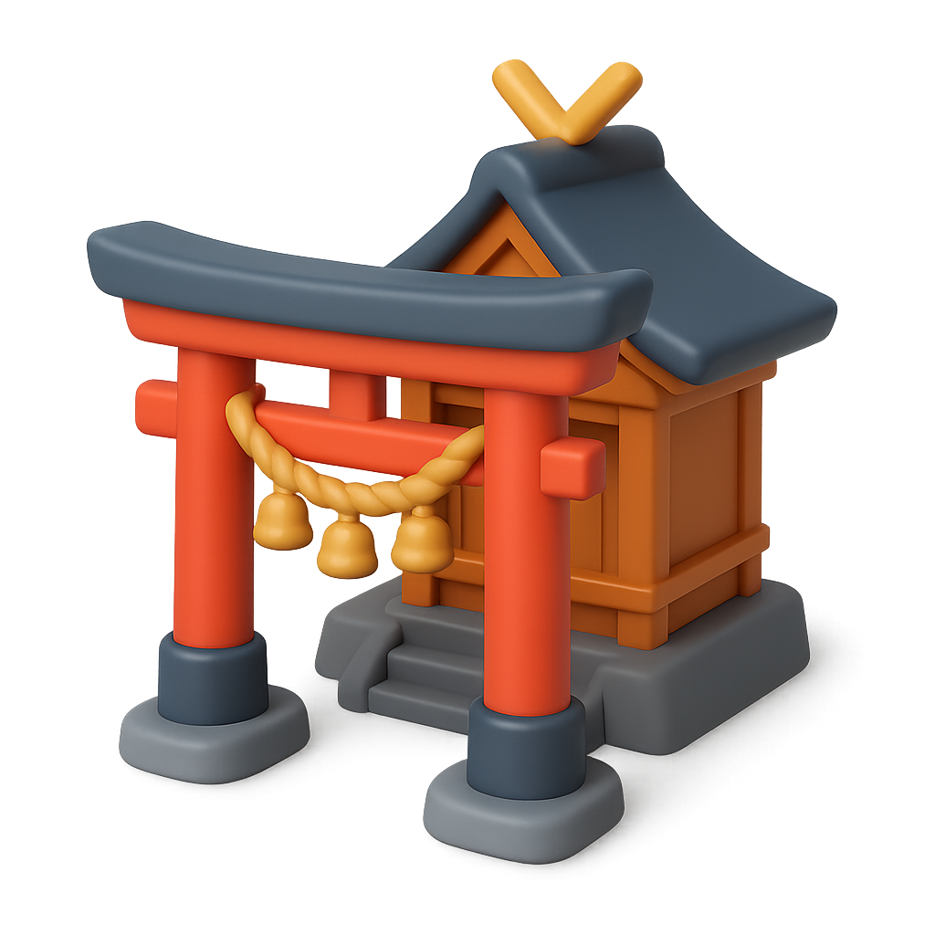 A colorful 3D representation of a Shinto shrine, featuring a traditional torii gate and a small shrine building. Rendered in a three-quarter isometric view with a volumetric feel.
