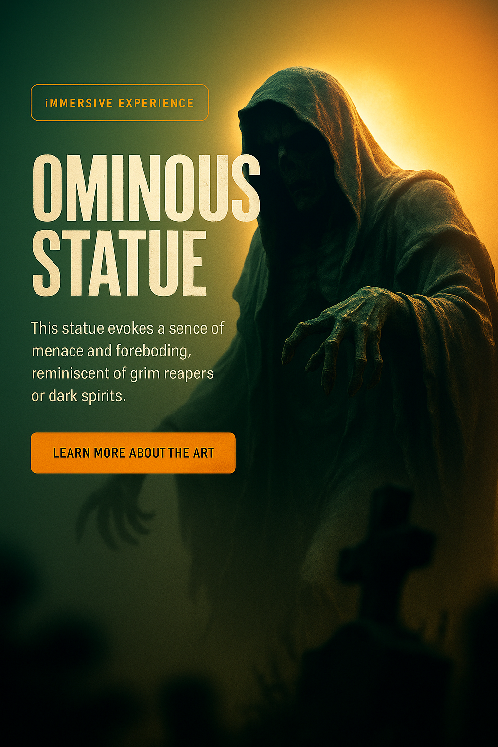 A striking statue draped in shadows and light, exuding an aura of menace. The eerie figure resembles a grim reaper, set against a dynamic, colorful background that enhances its ominous presence.