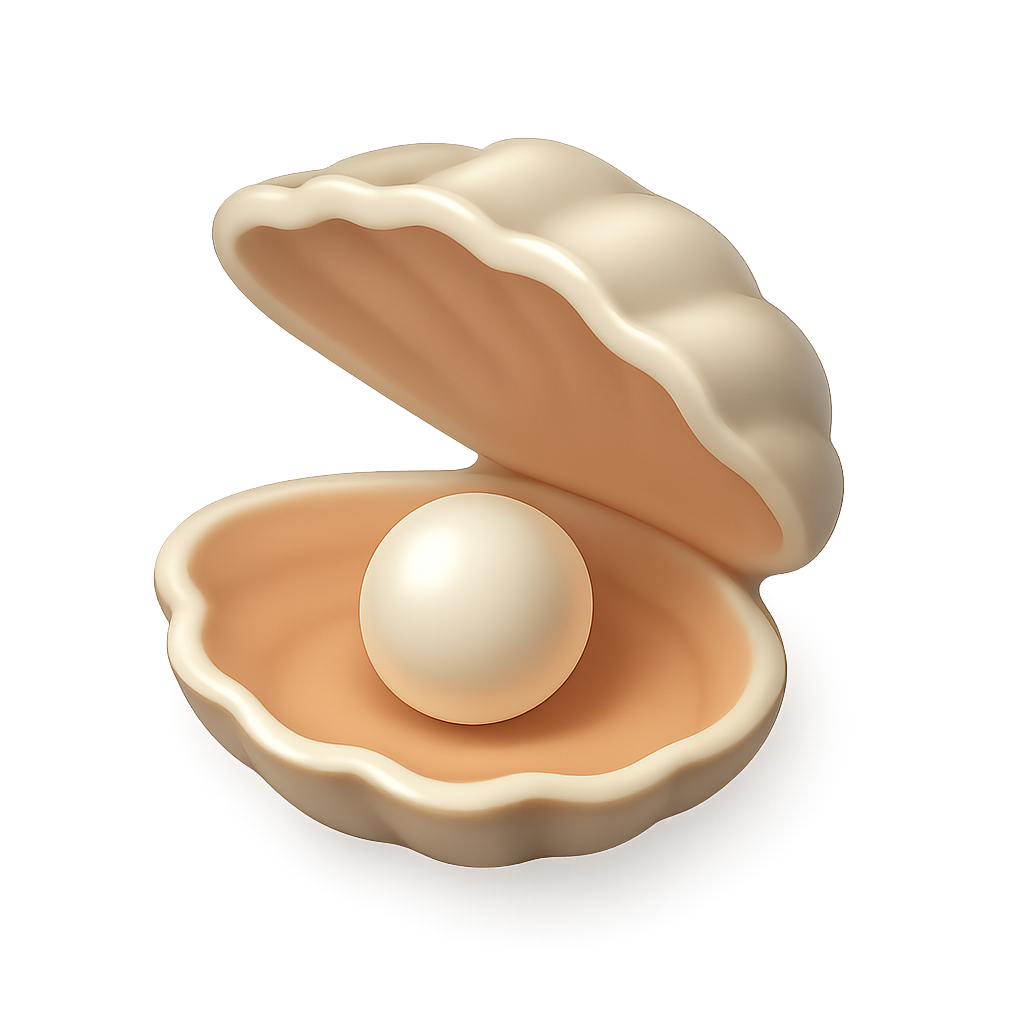 A beautifully rendered 3D icon of an open oyster showcasing a lustrous pearl inside. The design features a soft color palette and a three-quarter view for added depth.