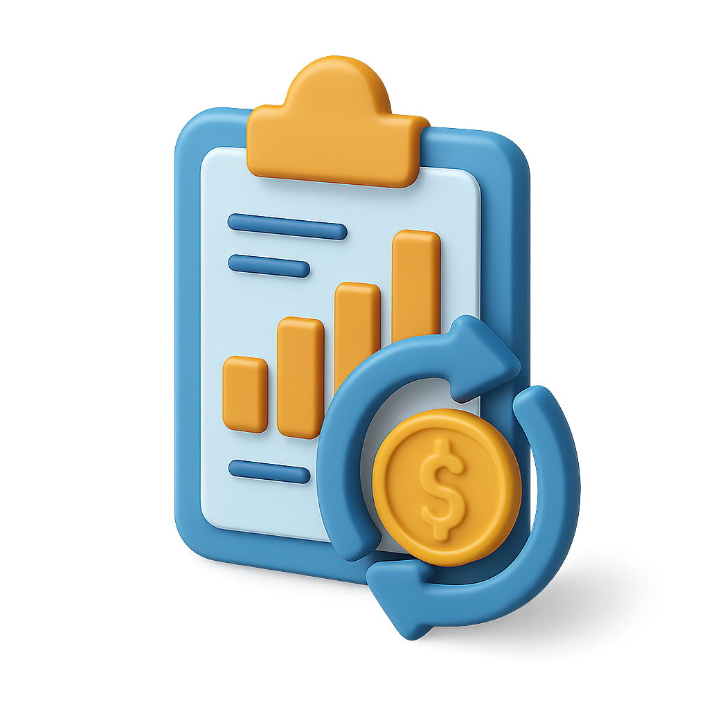/Collection: /by davooda/Type: PNG/A vibrant 3D icon depicting a clipboard with a bar graph and a currency symbol, rendered in a three-quarter view. The design features a blend of blue and orange colors, enhancing its volumetric look.