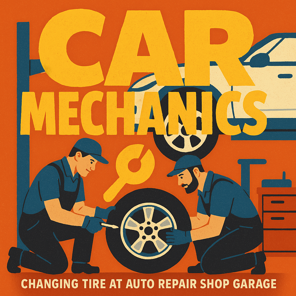Illustrative Auto Repair Scene Featuring Mechanics Changing a Tire