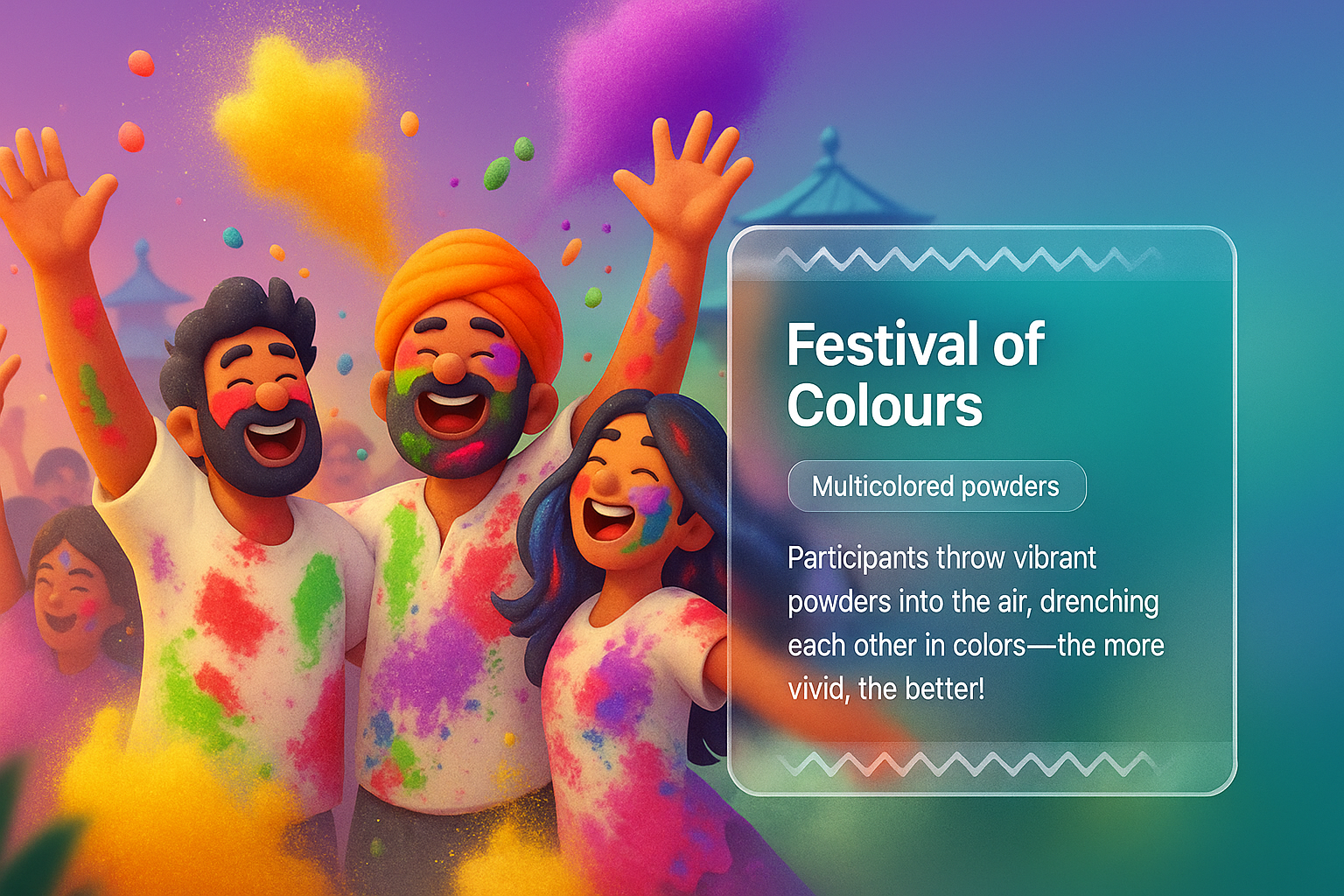 /Collection: /by davooda/Type: PNG/A lively 3D illustration depicting people joyfully celebrating the Holi festival, throwing colorful powders in the air. The scene radiates happiness with vibrant colors and dynamic expressions.