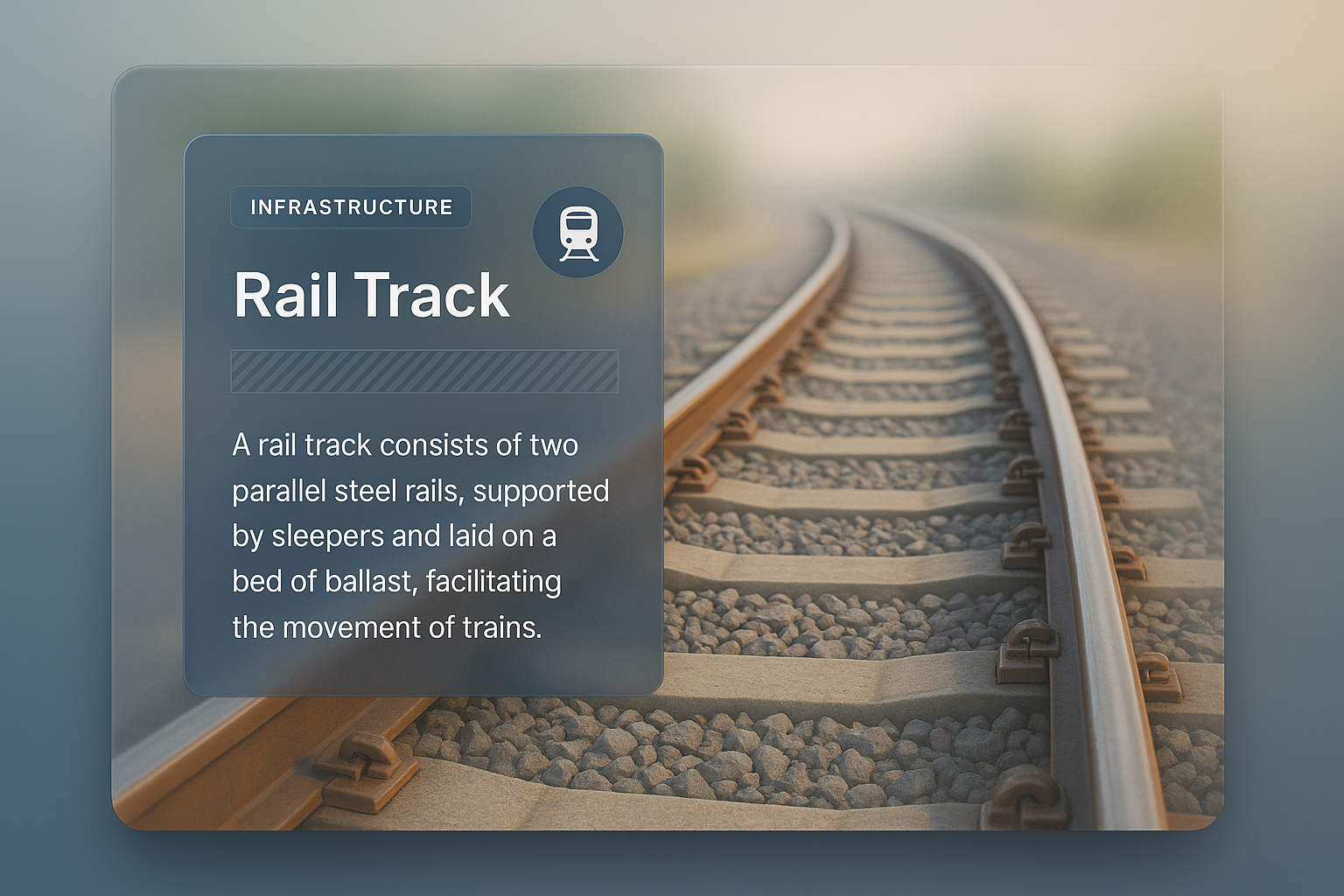 /Collection: /by davooda/Type: PNG/A visually appealing 3D illustration of a rail track, featuring a transparent overlay with informative text and an icon. The design integrates light colors and smooth gradients for a modern look.
