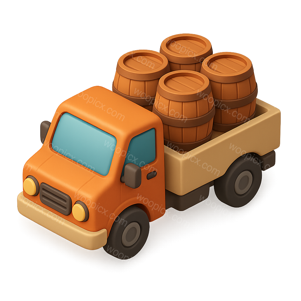A colorful, stylized 3D icon of a delivery truck carrying four wooden barrels, presented in an isometric view with a transparent background.