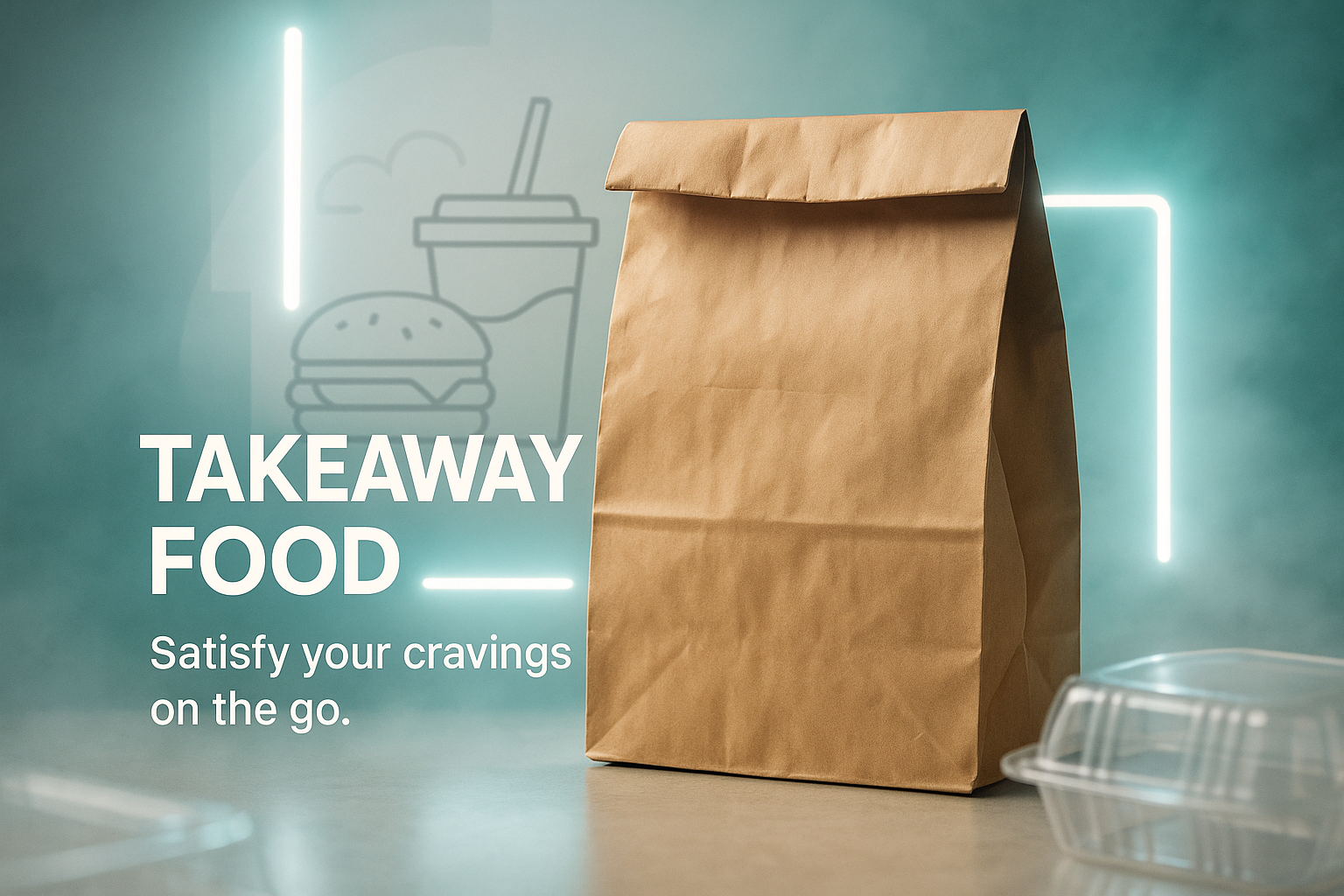 /Collection: /by davooda/Type: PNG/Stylish food packaging image featuring a brown paper bag designed for takeaway meals, set against a blurred background with modern graphic elements. Ideal for food delivery services.