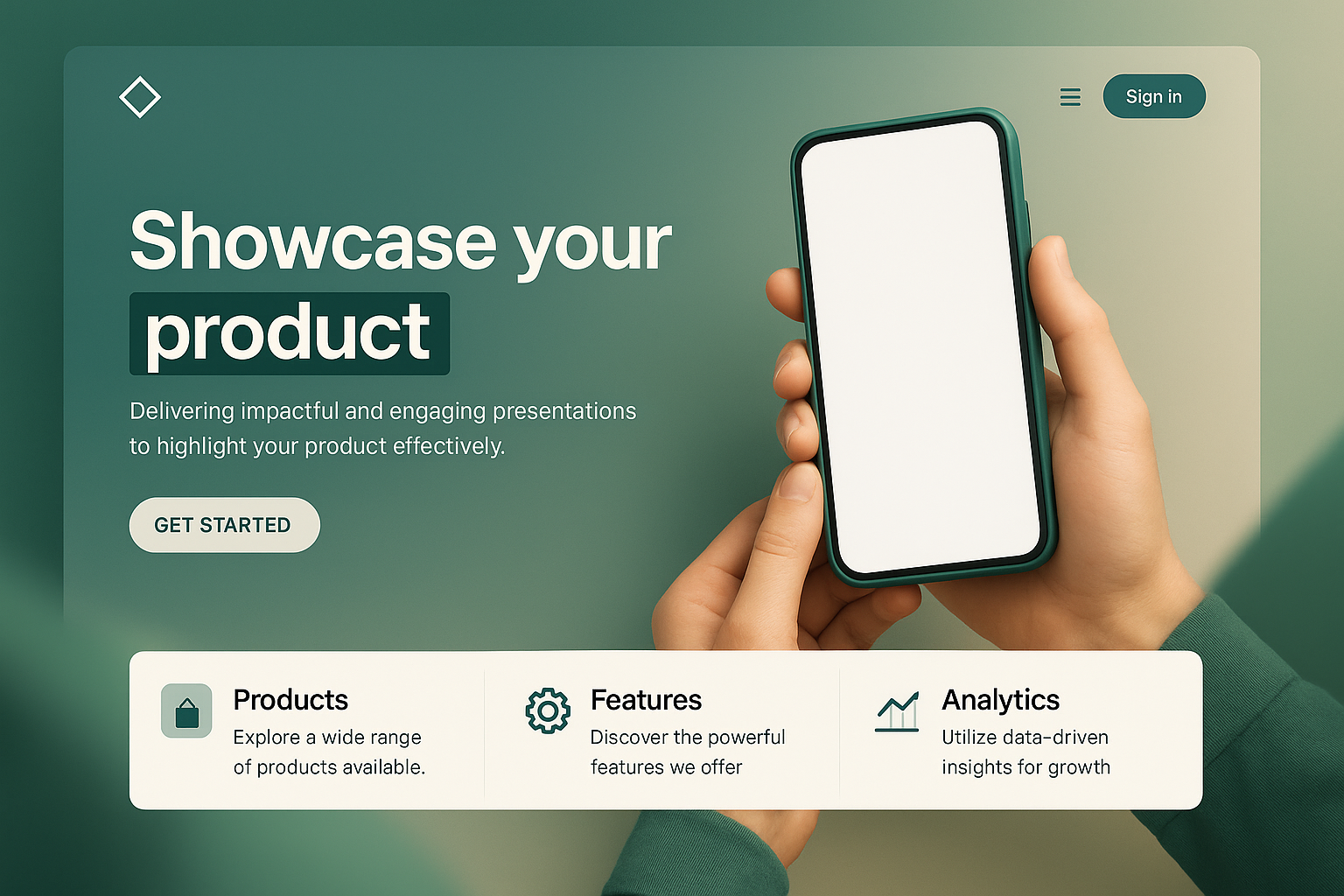 A sleek landing page design illustrating a green phone held in hands, featuring a clean layout with sections for products, features, and analytics. The design emphasizes readability and visual hierarchy.