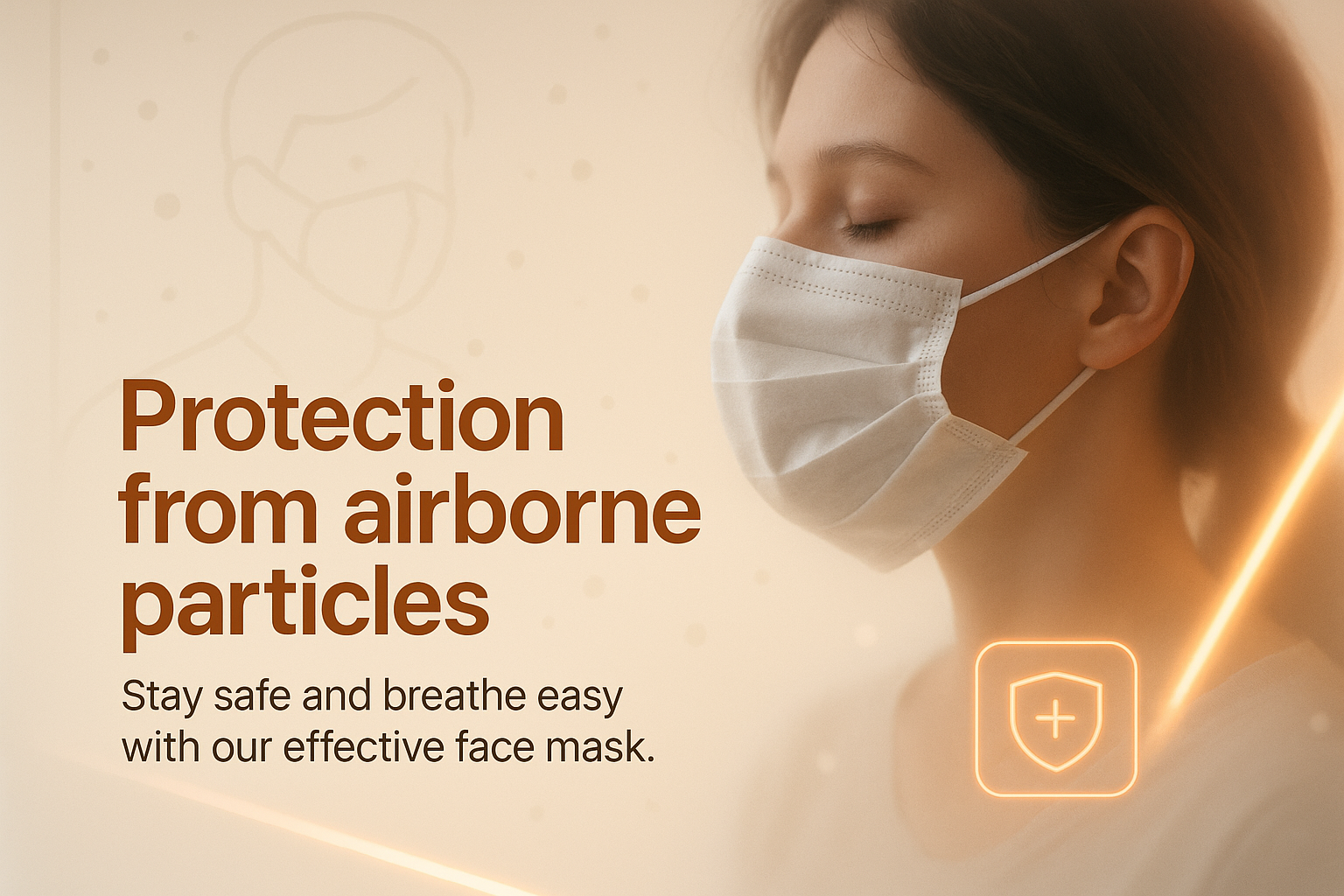 Informative graphic promoting the use of face masks for protection against airborne particles. Features a calm visual style with a focus on safety and health.