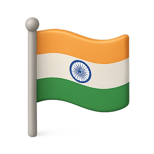 Stylized 3D emoji of the Indian national flag, featuring its distinctive orange, white, and green horizontal stripes with a blue Ashoka Chakra, suitable for digital communication and social media use.