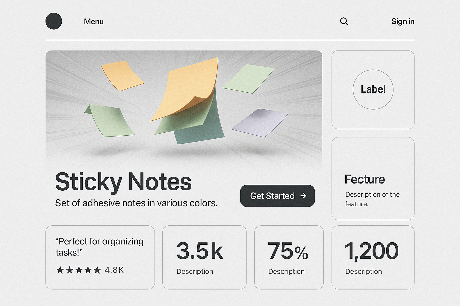 /Collection: /by davooda/Type: PNG/A sleek landing page featuring a bento layout with sticky notes in various colors. The design includes a menu, action buttons, and subtle dynamic elements for visual interest.