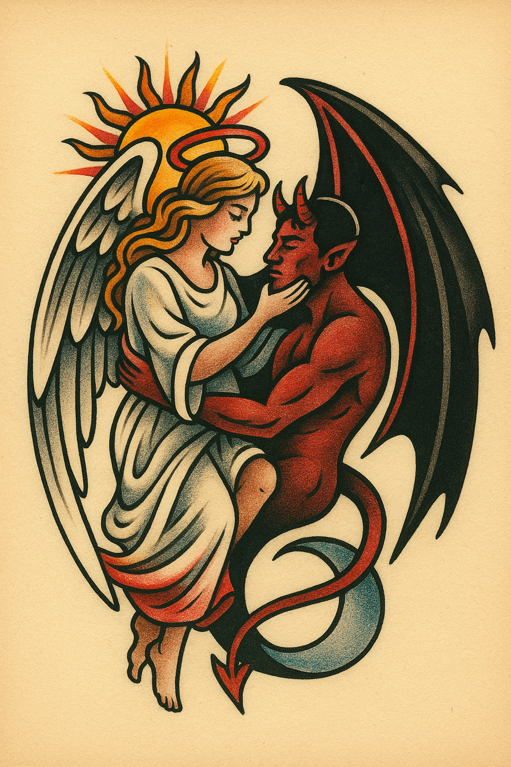 /Collection: /by davooda/Type: PNG/A striking tattoo design featuring an angel and a devil intertwined, symbolizing the duality of light and darkness. The artwork showcases vibrant colors against a soft beige background.