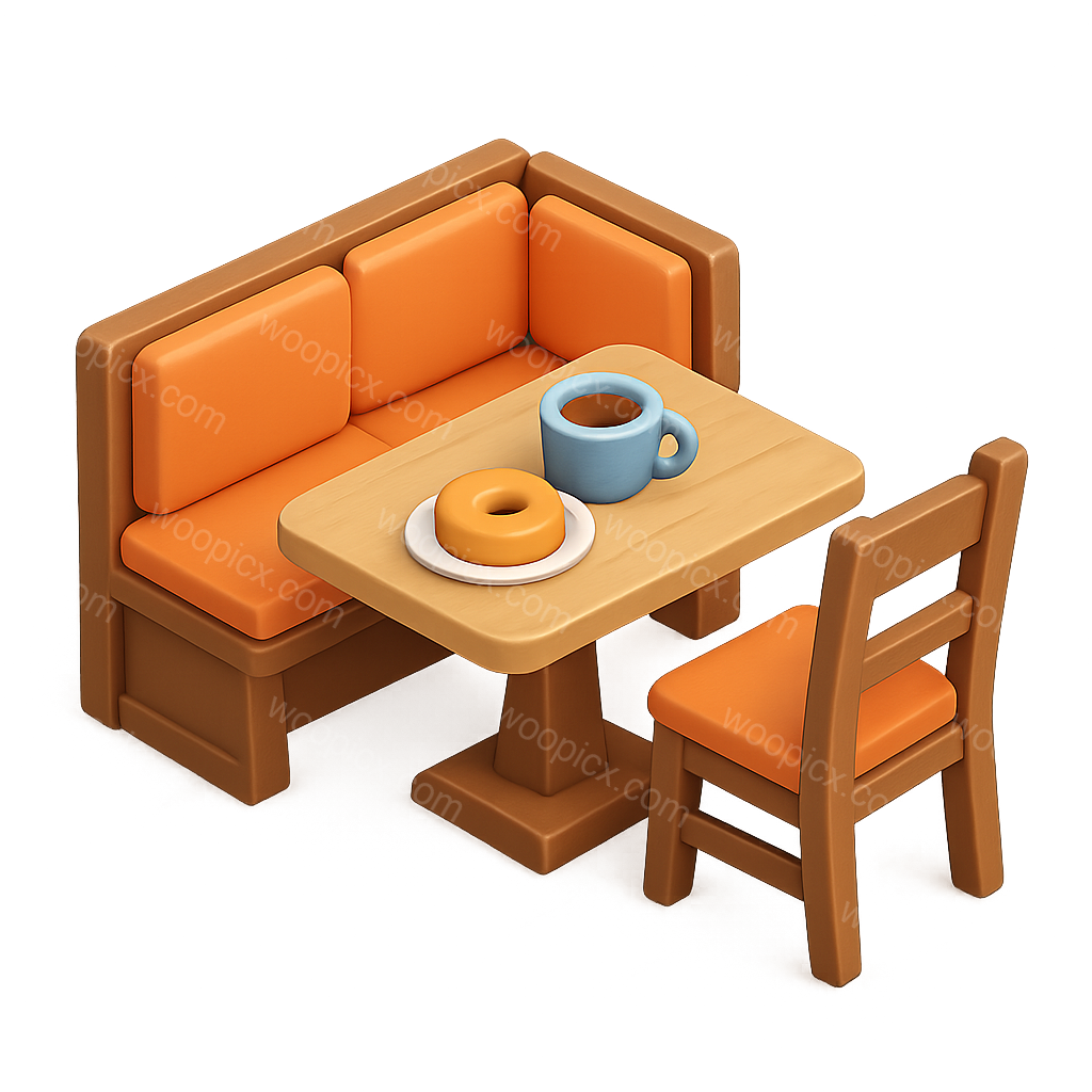 /Premium/Collection: /by davooda/Type: PNG/A charming 3D icon depicting a breakfast nook featuring a wooden table with a donut and a coffee cup, complemented by a cozy orange-cushioned bench and chair, all in an isometric view.