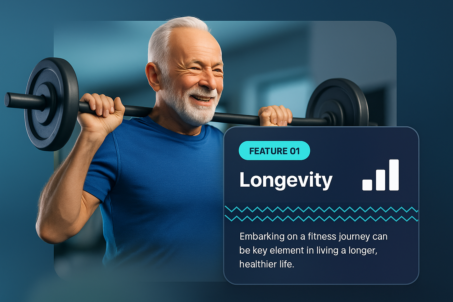 /Collection: /by davooda/Type: PNG/A senior man joyfully lifting weights in a gym setting, emphasizing a healthy lifestyle. The image features a vibrant gradient background and a visually integrated feature block highlighting fitness longevity.