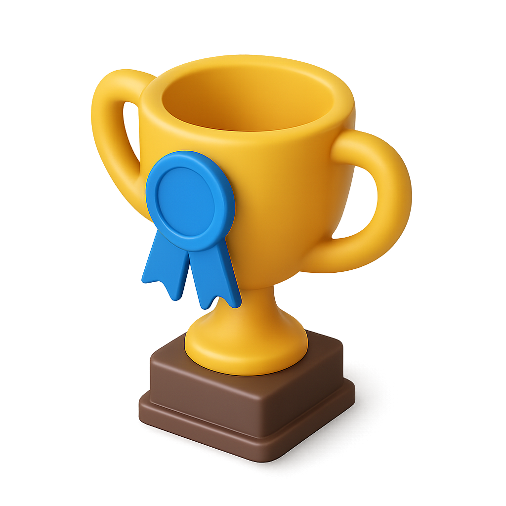 A vibrant 3D trophy icon featuring a yellow cup with a blue ribbon, set on a brown base. The design has a glossy finish and a volumetric, isometric perspective.