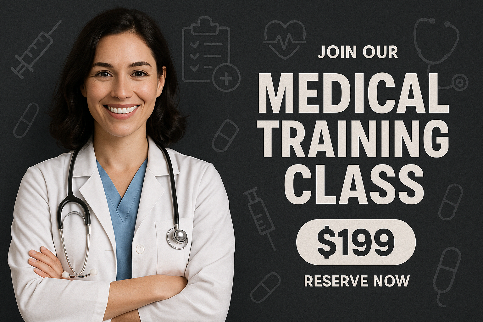/Collection: /by davooda/Type: PNG/A cheerful female medical professional stands confidently in a seminar room, promoting a medical training class. The background features light textures with simple medical-themed illustrations.