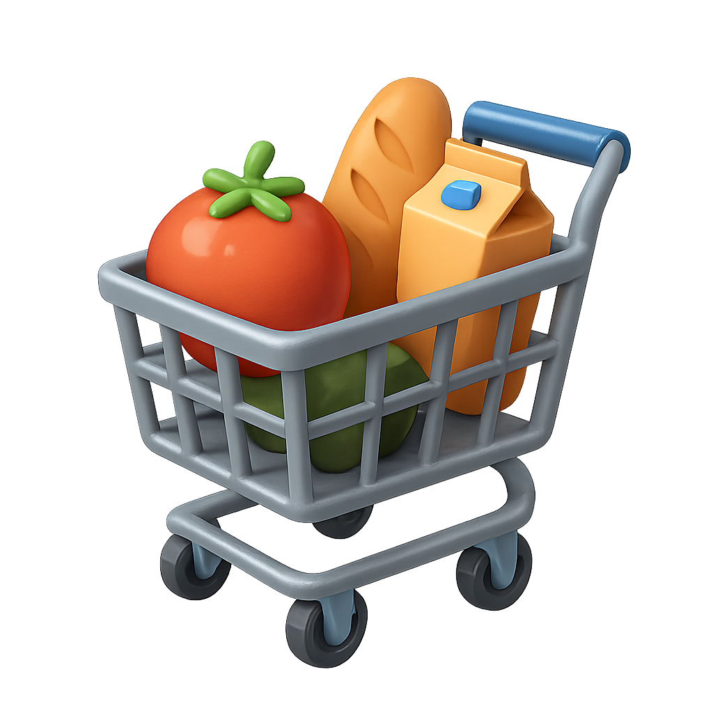 A 3D shopping cart featuring a tomato, cucumber, a loaf of bread, and a carton of juice, depicted in a three-quarter isometric view with a transparent background.