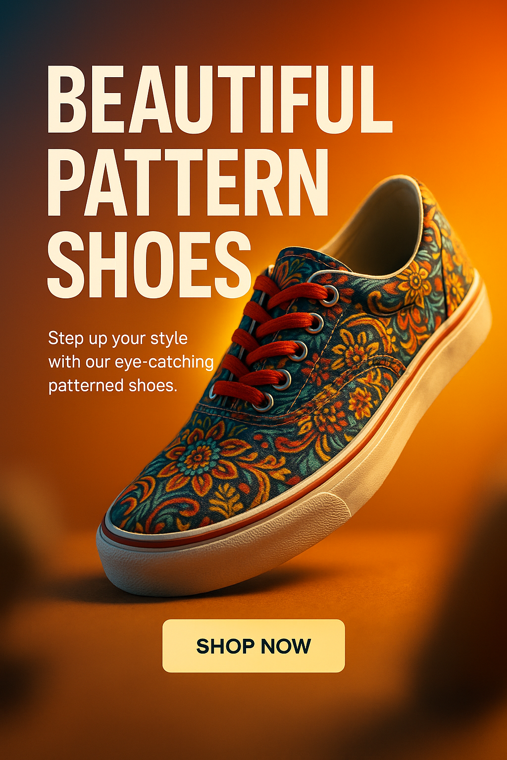 This image is a promotional graphic showcasing a vibrant patterned shoe. It features a warm color palette and modern design elements, aimed at attracting fashion-conscious consumers.