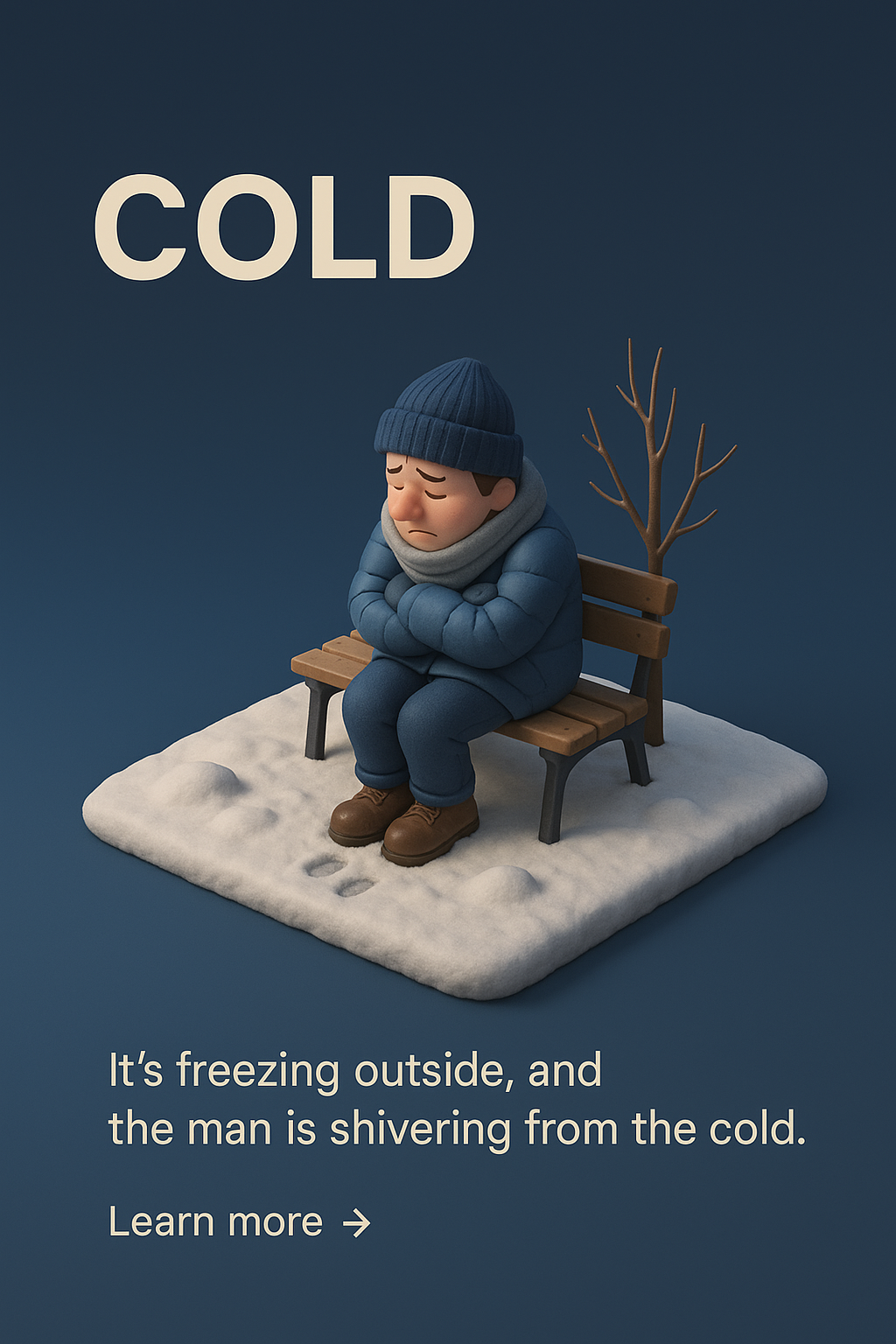/Collection: /by davooda/Type: PNG/A detailed 3D scene depicting a man sitting on a bench, shivering from the cold. The background features a smooth gradient transitioning to a solid color, enhancing the chilly atmosphere.