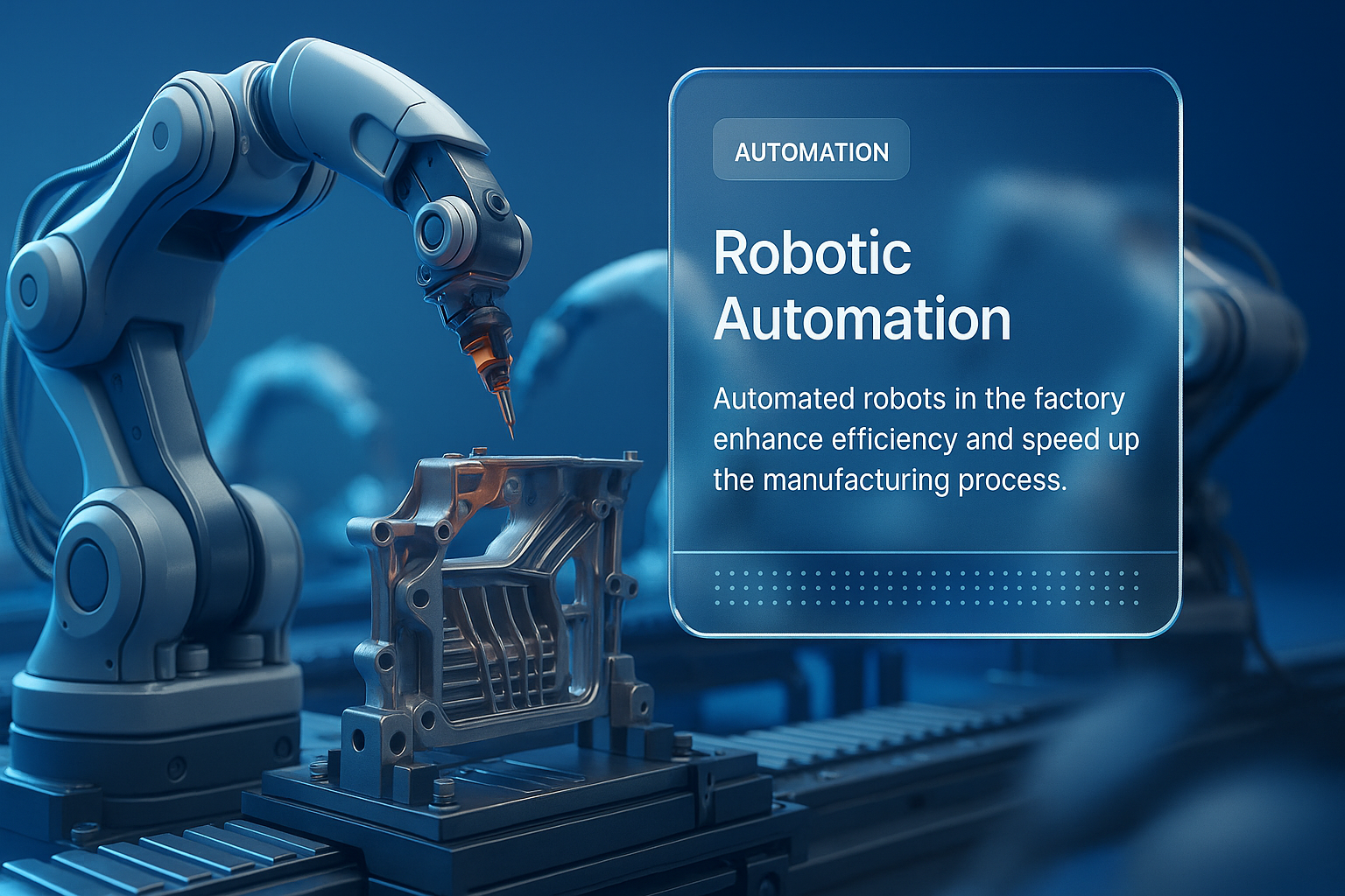 /Collection: /by davooda/Type: PNG/A high-tech industrial factory featuring advanced robotic automation. The scene includes a robotic arm working on an automotive part, set against a sleek gradient background, emphasizing modern manufacturing.