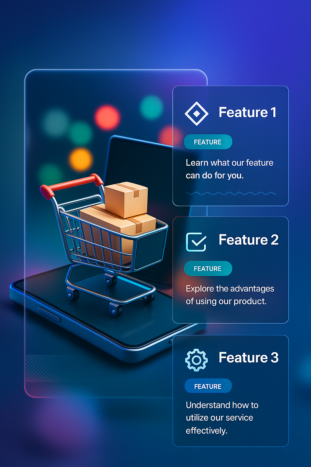 A visually engaging 3D illustration of a shopping cart filled with boxes positioned on mobile and tablet screens. The background features colorful lights, enhancing the shopping theme.