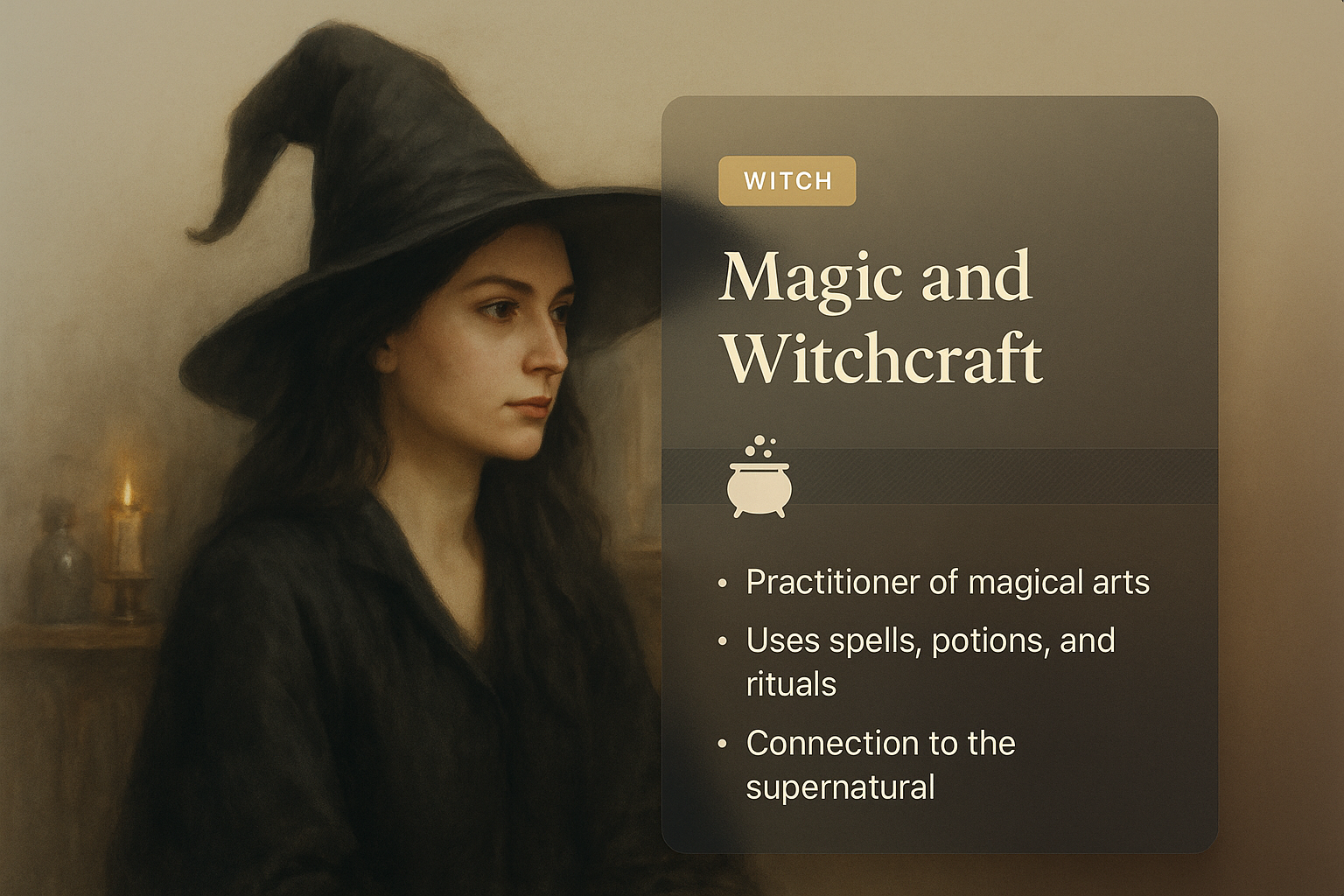 A captivating illustration of a witch, featuring a dark glass overlay with a text block. The design integrates a gradient background and a clear focus on magic and witchcraft themes.