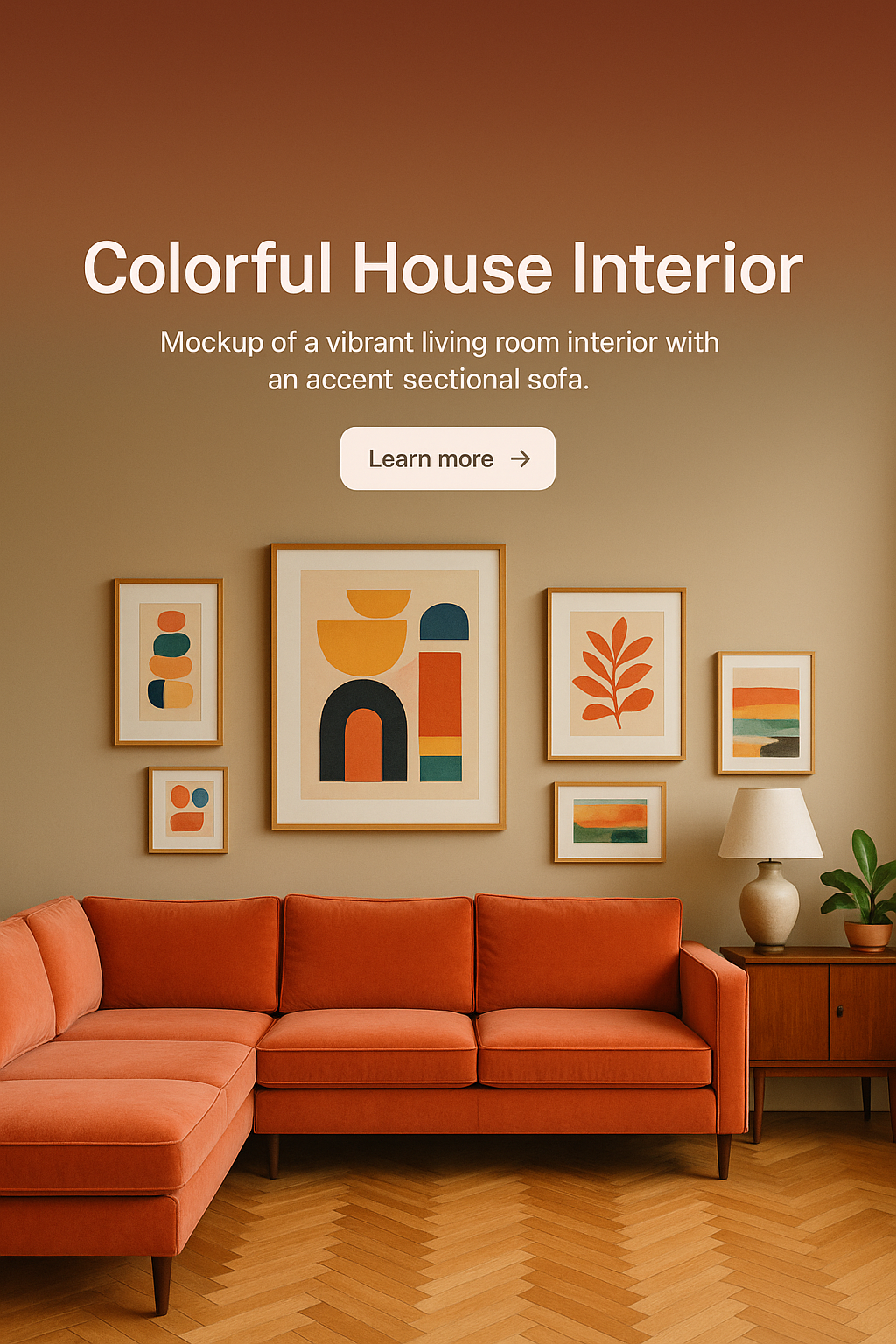 A vibrant living room featuring a coral sectional sofa against dark beige walls. The room showcases colorful artwork and a mid-century modern aesthetic.