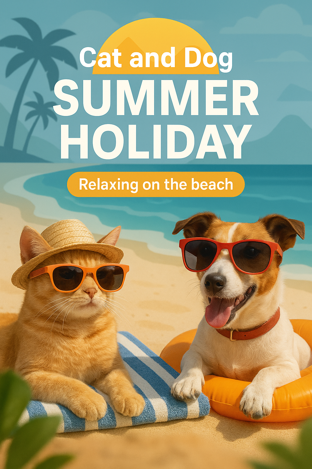 Vibrant and cheerful graphic featuring a cat and dog enjoying a summer holiday at the beach. Ideal for pet-related promotions or social media posts.