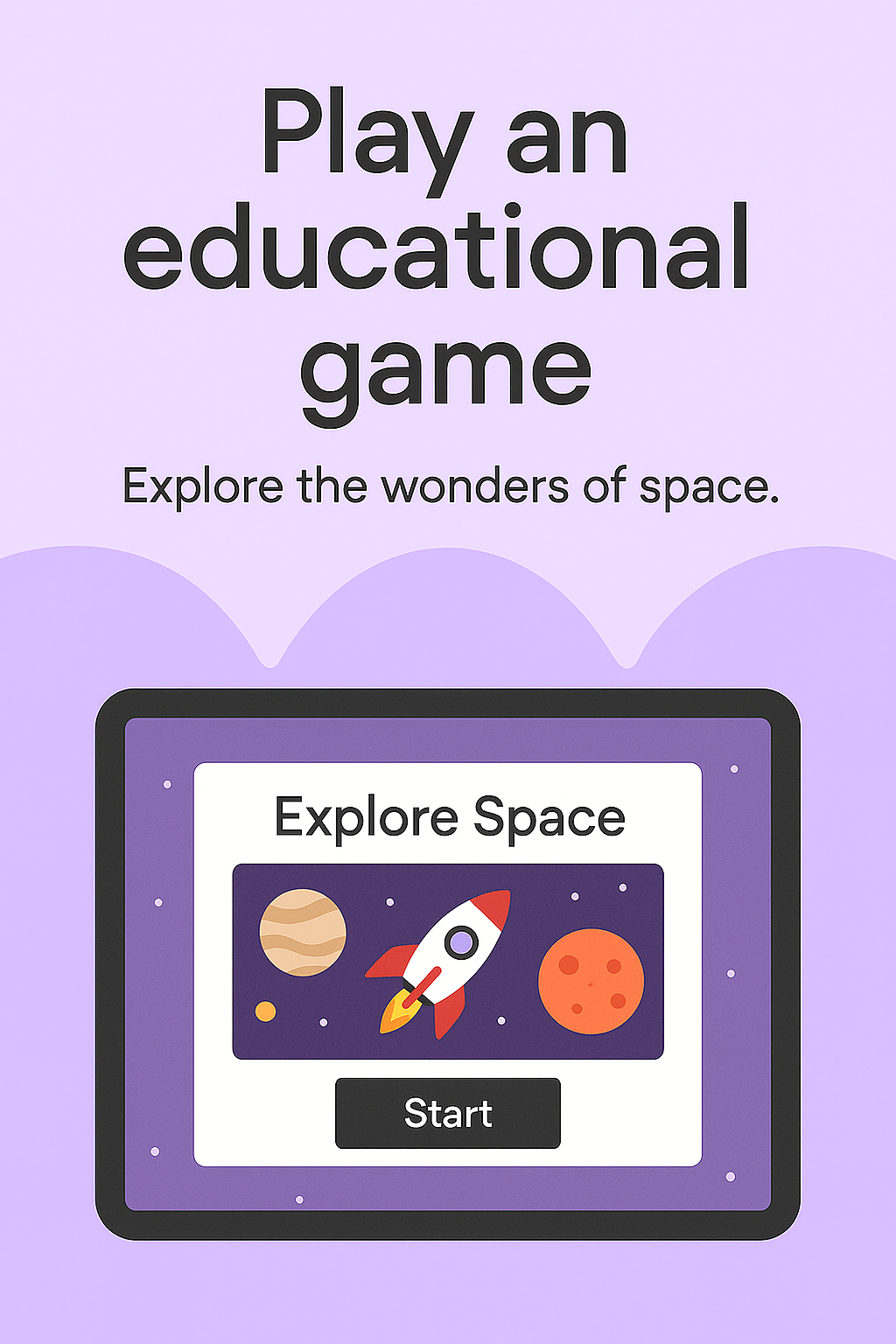 /Collection: /by davooda/Type: PNG/Colorful promotional graphic for an educational game focused on space exploration, featuring engaging visuals and a user-friendly design perfect for attracting young learners.