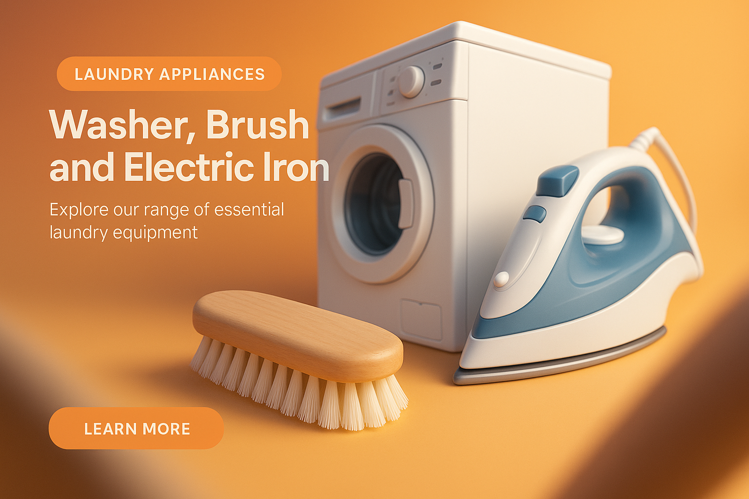 /Collection: /by davooda/Type: PNG/A vibrant promotional image showcasing a washer, brush, and electric iron, designed for marketing laundry appliances. The modern layout and clean design appeal to household consumers.