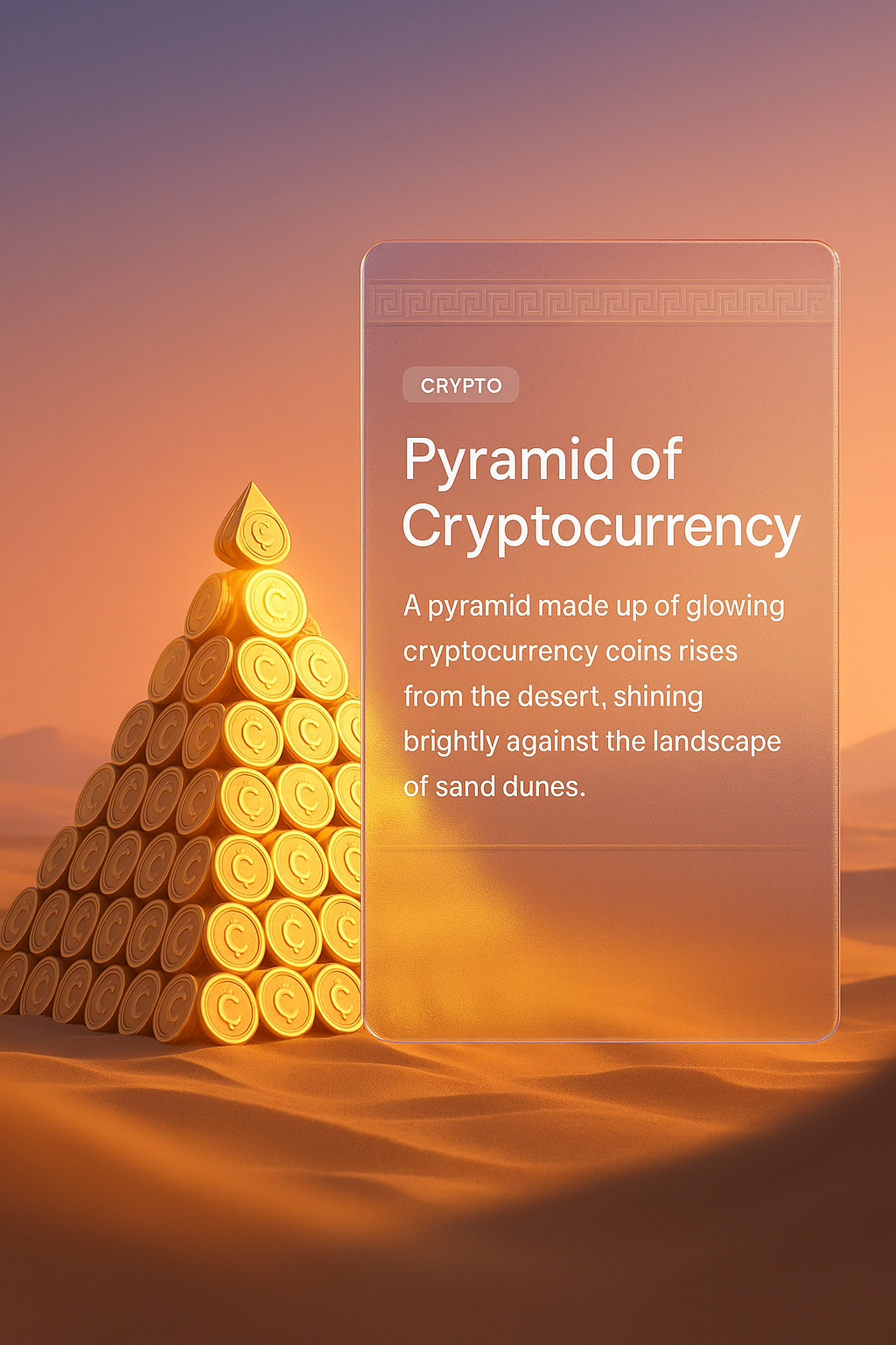 /Collection: /by davooda/Type: PNG/A stunning 3D illustration of a pyramid made of glowing cryptocurrency coins set against a desert backdrop. The design features a transparent block with text and patterns, enhancing the visual appeal.
