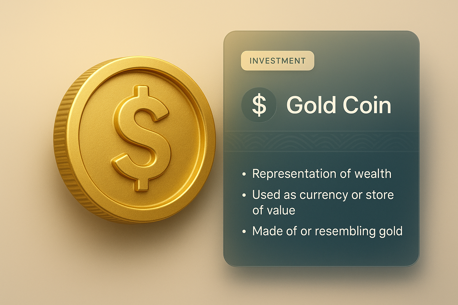 A realistic gold coin featuring a dollar symbol, accompanied by an integrated info block detailing its significance as an investment. The design is light with a smooth gradient background.