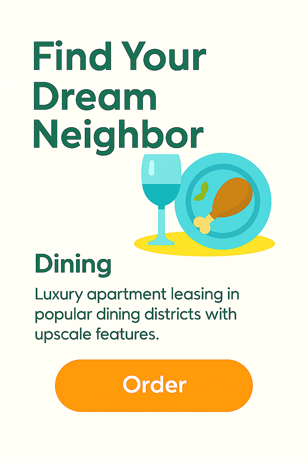 /Collection: /by davooda/Type: PNG/Vibrant social media post promoting luxury apartment leasing in dining districts, featuring playful graphics and inviting colors, ideal for attracting potential renters.