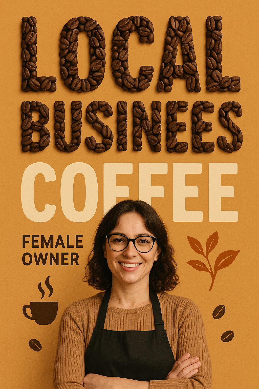 /Collection: /by davooda/Type: PNG/Promotional poster for a local coffee business showcasing the female owner with a warm color palette and coffee-themed graphics, ideal for social media or local advertising.