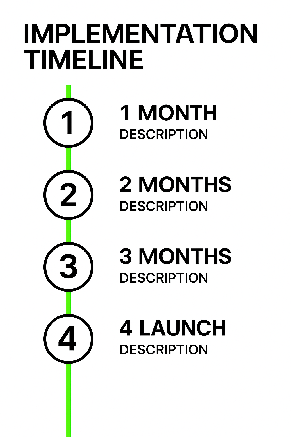 /Collection: /by davooda/Type: PNG/A clean and straightforward infographic outlining an implementation timeline with distinct milestones. Ideal for project management presentations and planning.