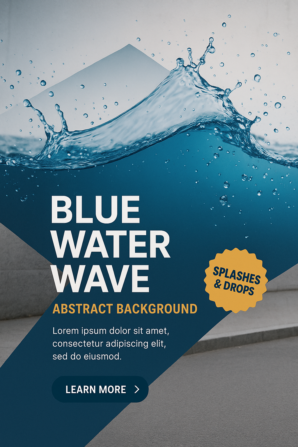 A visually striking abstract design featuring realistic blue water waves and splashes against a non-transparent background. The composition balances text and design elements for clarity.