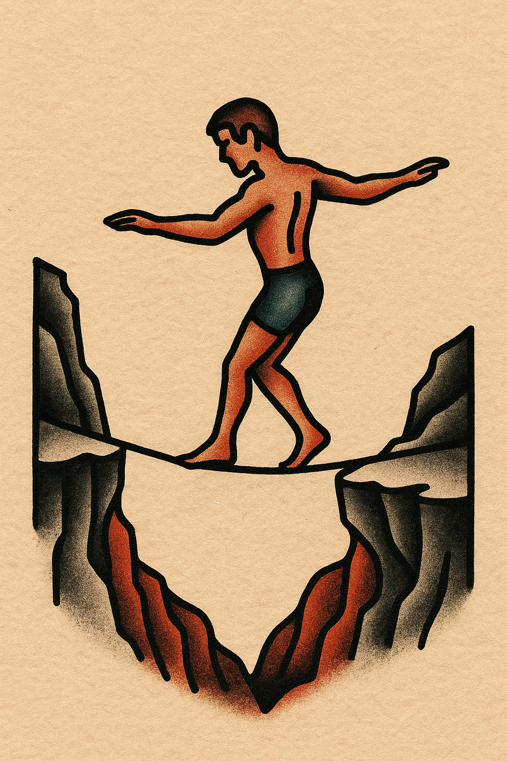 Balancing Act Over a Chasm - Classic Tattoo Design