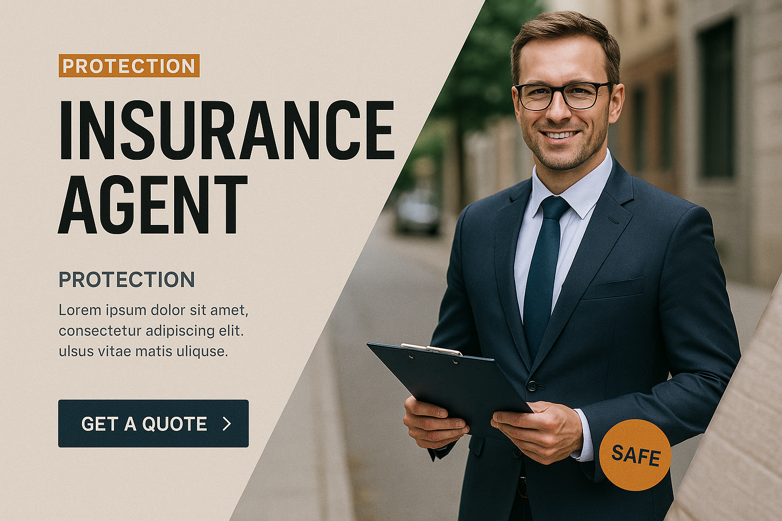 /Collection: /by davooda/Type: PNG/A confident insurance agent stands on a city street, holding a clipboard. The design features a strong contrast with bold typography and a clear call-to-action button, enhancing professionalism.