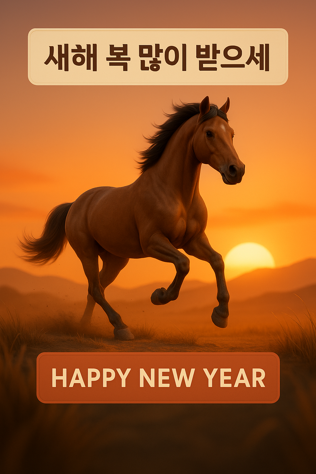 This image features a galloping horse against a sunset backdrop, symbolizing the New Year. It combines warm colors and an inspiring theme, ideal for festive greetings.