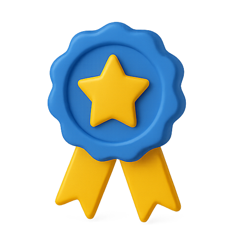 A stylized 3D award badge featuring a star emblem and vibrant blue and yellow ribbons, ideal for recognition and achievement themes in graphic design.
