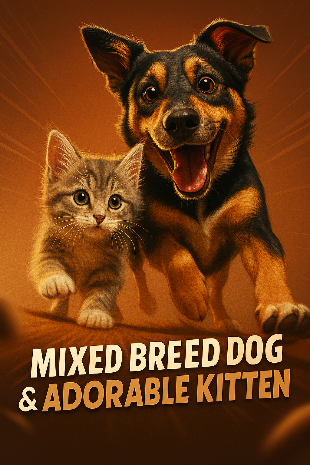 /Collection: /by davooda/Type: PNG/A heartwarming portrait featuring a mixed breed dog and an adorable kitten in a studio. The dynamic composition and warm colors create a joyful atmosphere, highlighting their friendship.