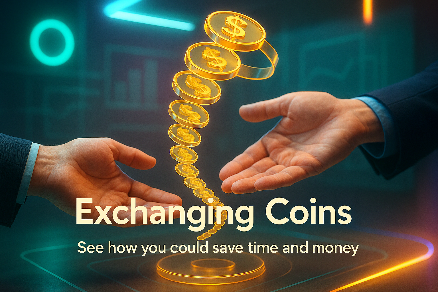 /Collection: /by davooda/Type: PNG/A vibrant digital illustration showcasing the concept of exchanging coins, featuring hands and glowing currency symbols. Ideal for finance-related content and promotional materials.
