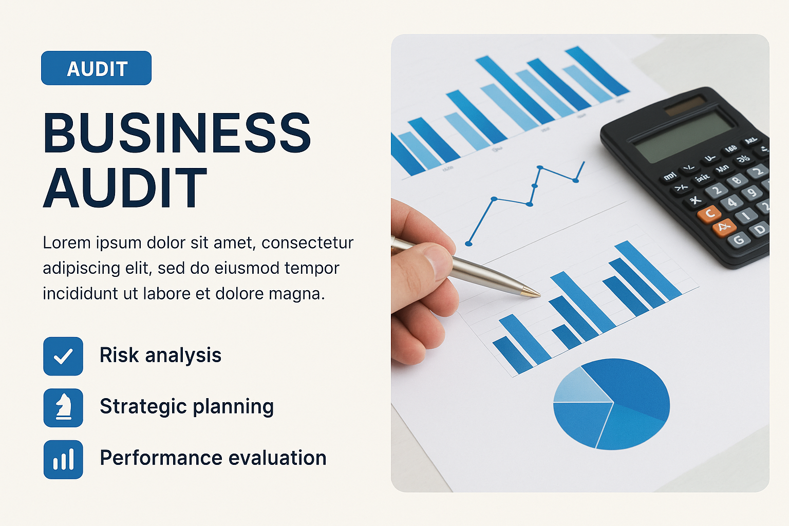Professional business audit graphic featuring charts and a calculator, ideal for presentations or reports on financial analysis and strategic planning.