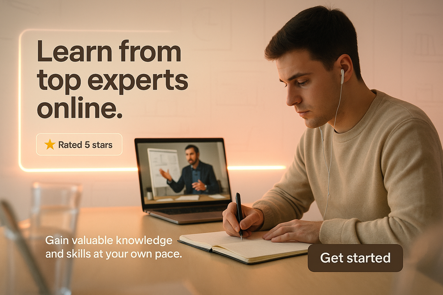 Promotional banner for online learning featuring a student taking notes with a laptop in the background, ideal for educational platforms and e-learning marketing.
