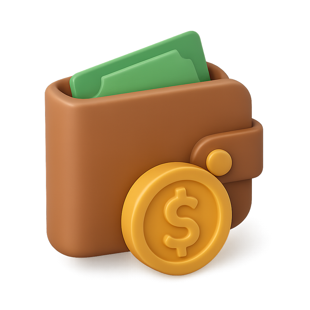 A 3D icon of a wallet featuring green cash and a prominent dollar sign. The design is isometric, with a volumetric feel and a transparent background.