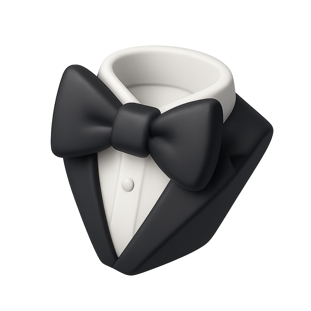 A minimalist 3D representation of a black-tie outfit featuring a bowtie and tuxedo collar. The design is isometric and volumetric, set against a transparent background.